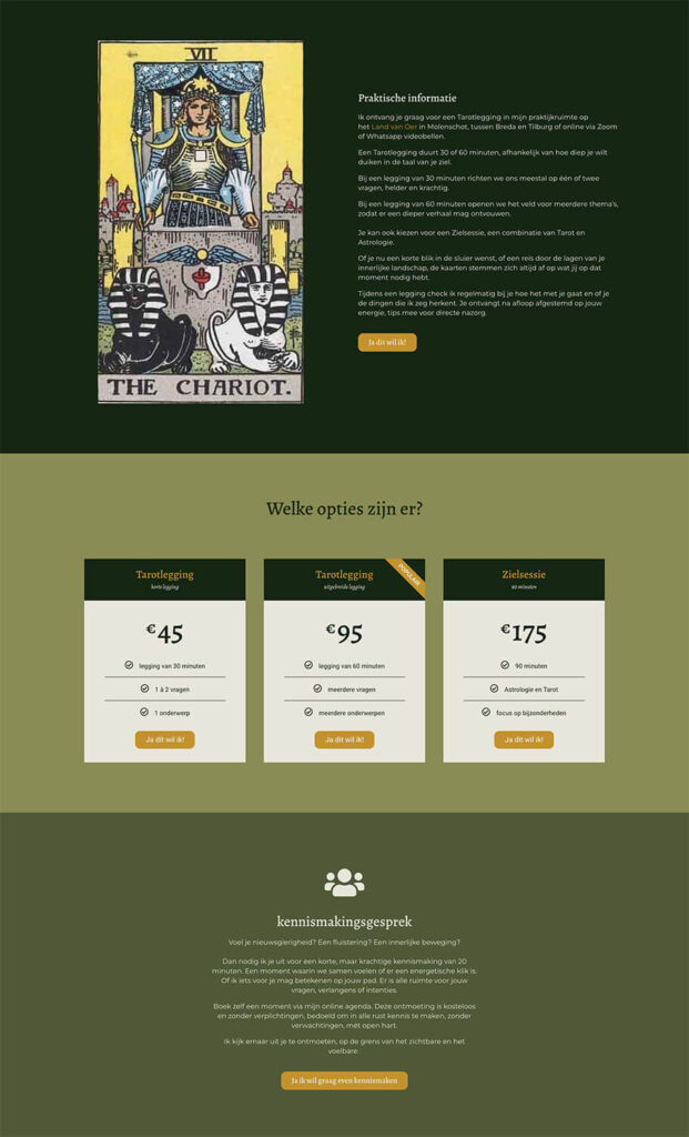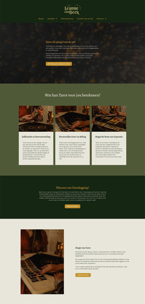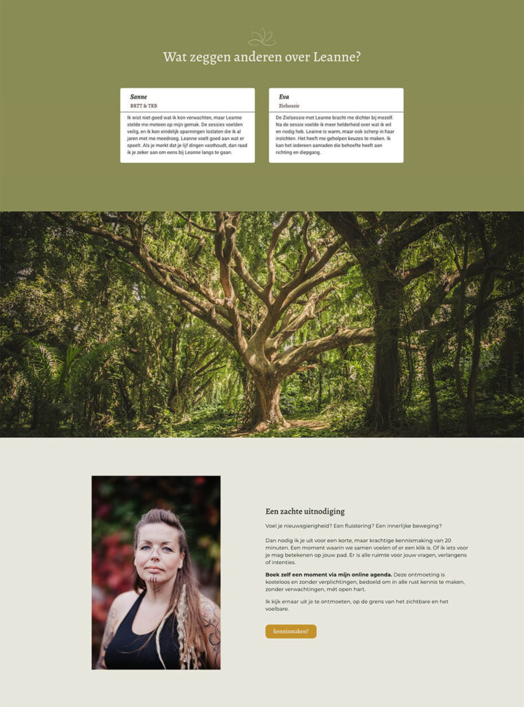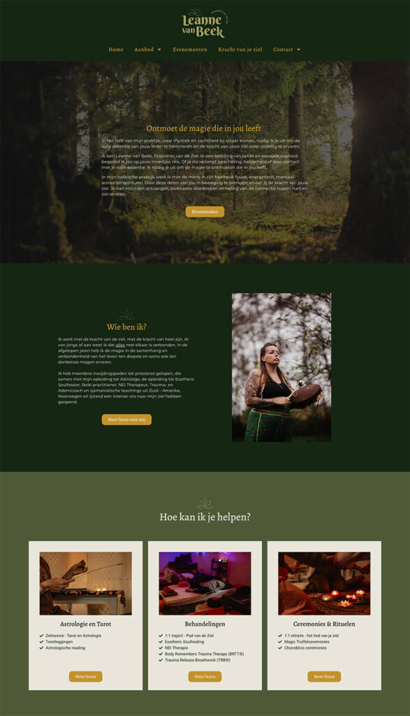 Nu we samen een prachtige huisstijl hadden gecreรซerd en passende social media templates hadden ontwikkeld om haar Instagram mooi in lijn te brengen, werd het tijd om het ook wat professioneler aan te pakken. Tijd om de huisstijl door te trekken naar een nieuwe website, met daarin voldoende ruimte om al haar diensten helder neer te zetten. Hieronder zie je een kleine greep uit de webpaginaโs, met de uiteindelijke fotoโs en teksten van Leanne zelf.